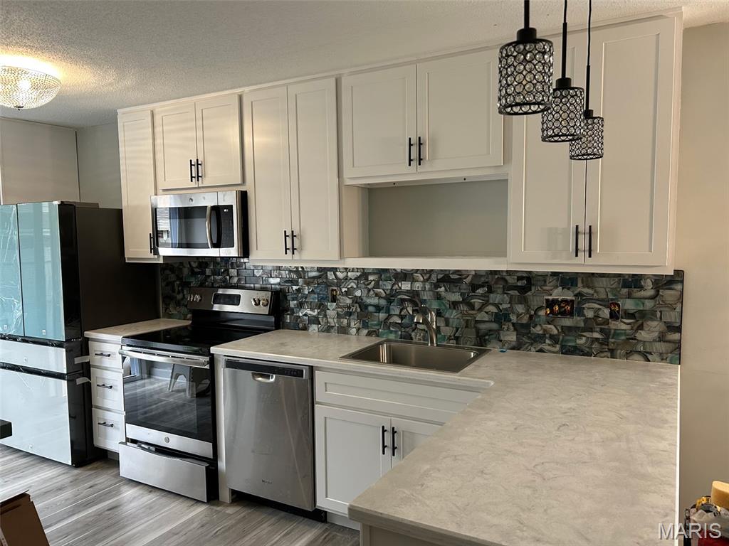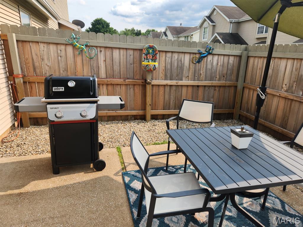 Welcome to this contemporary end-unit Ranch Villa offering two spacious bedrooms, an updated luxury bath, over-sized, insulated and drywalled one-car garage with plenty of storage. The open-concept floor plan is emersed with natural light, showcasing a vaulted ceiling which encapsulates the oversized living room providing warmth and ambiance from an electric "free - standing" fireplace. Vaulted dining area encased by a large bay window provides an abundance of natural light perfect for everyday living and entertaining. New full glass door with contemporary side light! The updated kitchen features all-new cabinetry, counter depth new refrigerator, stainless steel appliances, a breakfast bar, oversize pantry, and a updated sliding door leading to the private patio. Enjoy outdoor relaxation in your fully fenced patio with a 6-ft privacy fence, gated access, and a serene rock-landscaped oasis. The spacious primary suite is a true retreat, featuring a " walk in" ample closet, updated, spa-like bath with garden tub, separate shower, dual sinks, two entry doors and tiled flooring. A main-floor laundry room with cabinets adds everyday convenience and direct access to garage. Additional highlights include an all-electric home, upgrade vinyl plank, plantation shutters, washer, dryer, and refrigerator included, new water heater (2023), ample storage throughout, and HOA dues that cover water and trash. Enjoy access to the subdivision pool and a prime location with quick highway and shopping access, yet peacefully tucked away in a tree-lined cul-de-sac with green space.