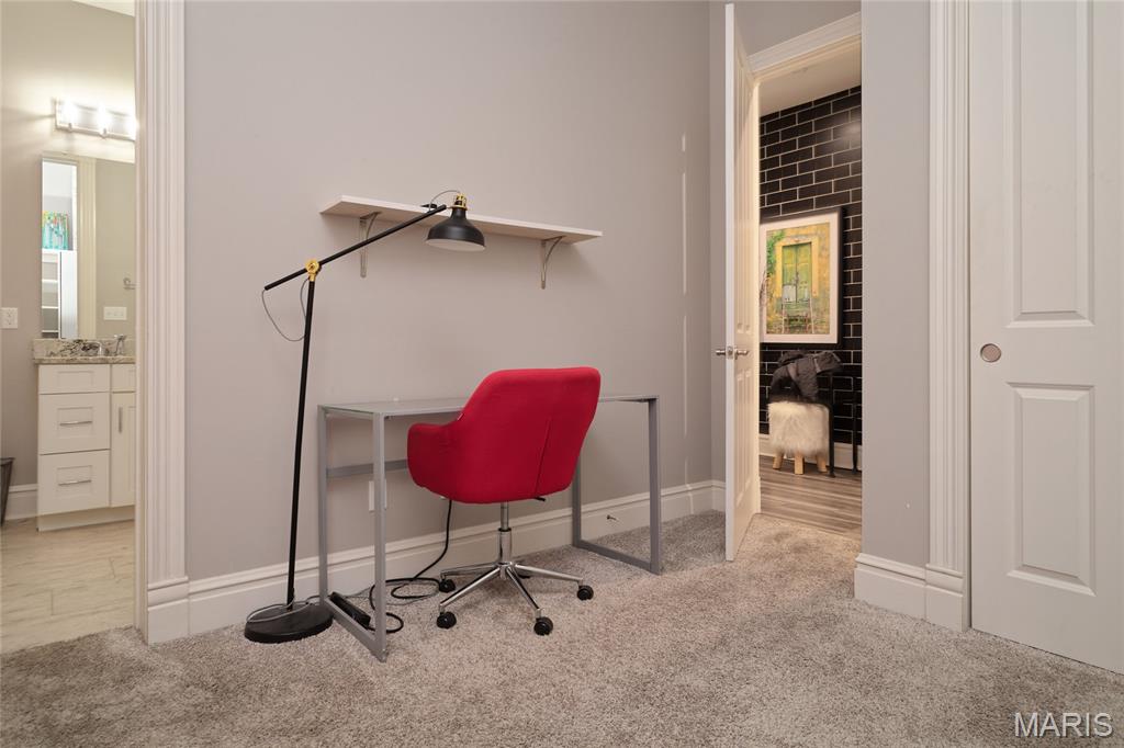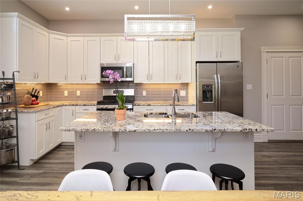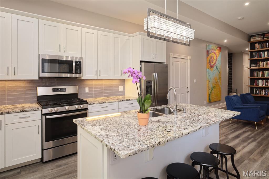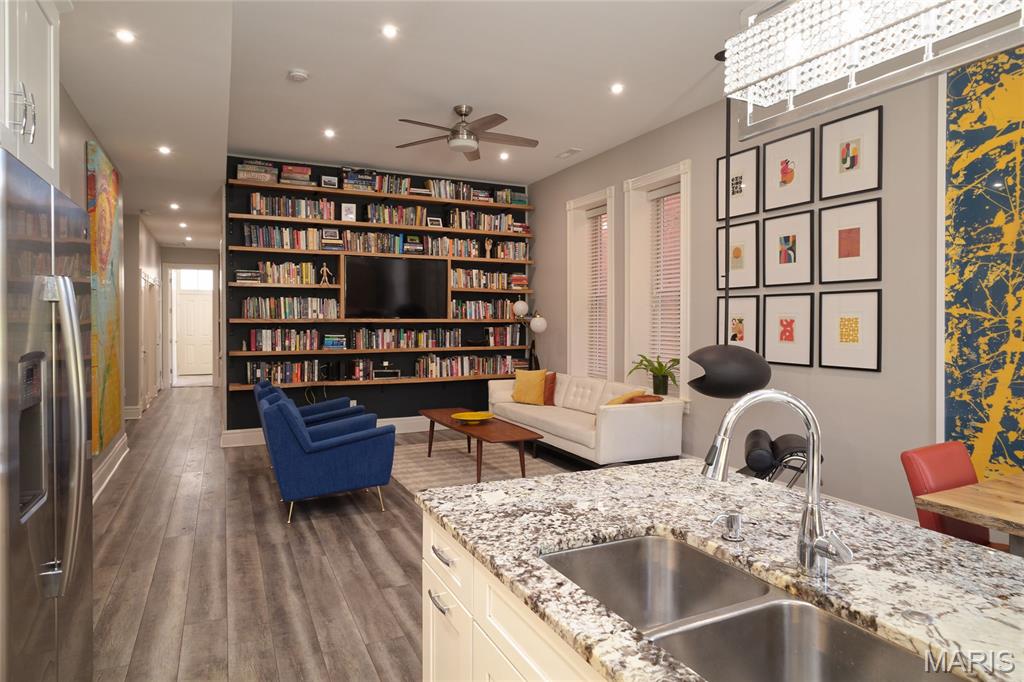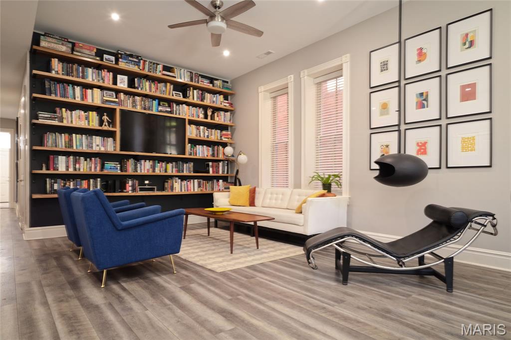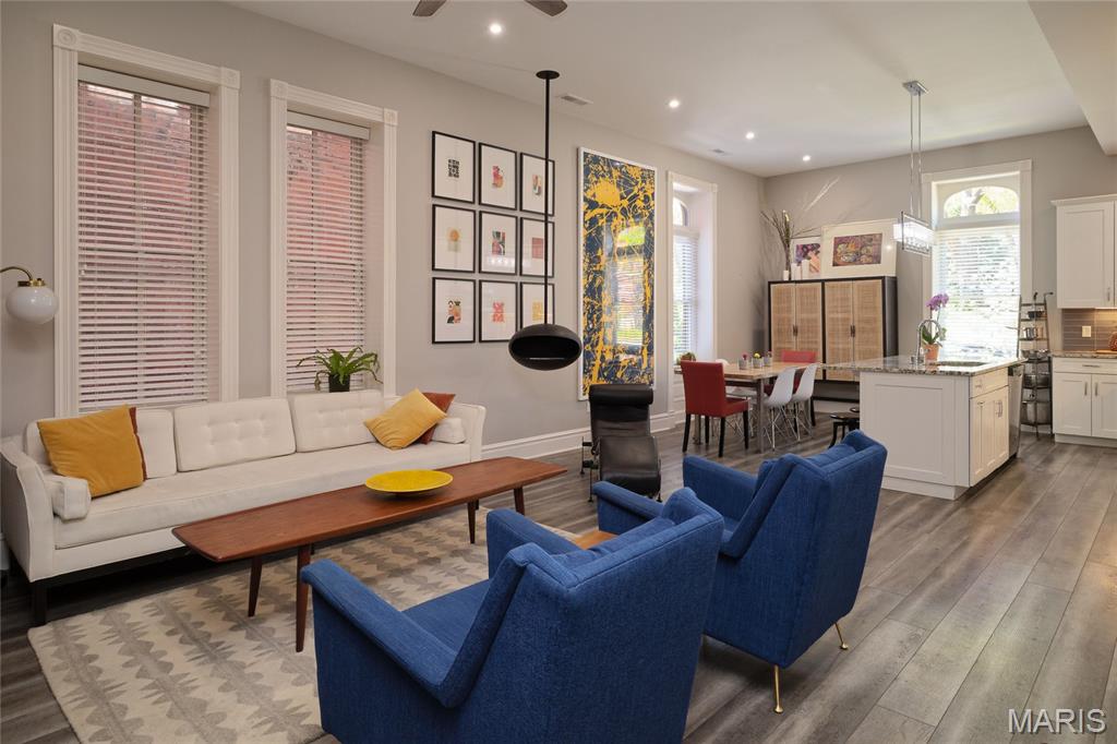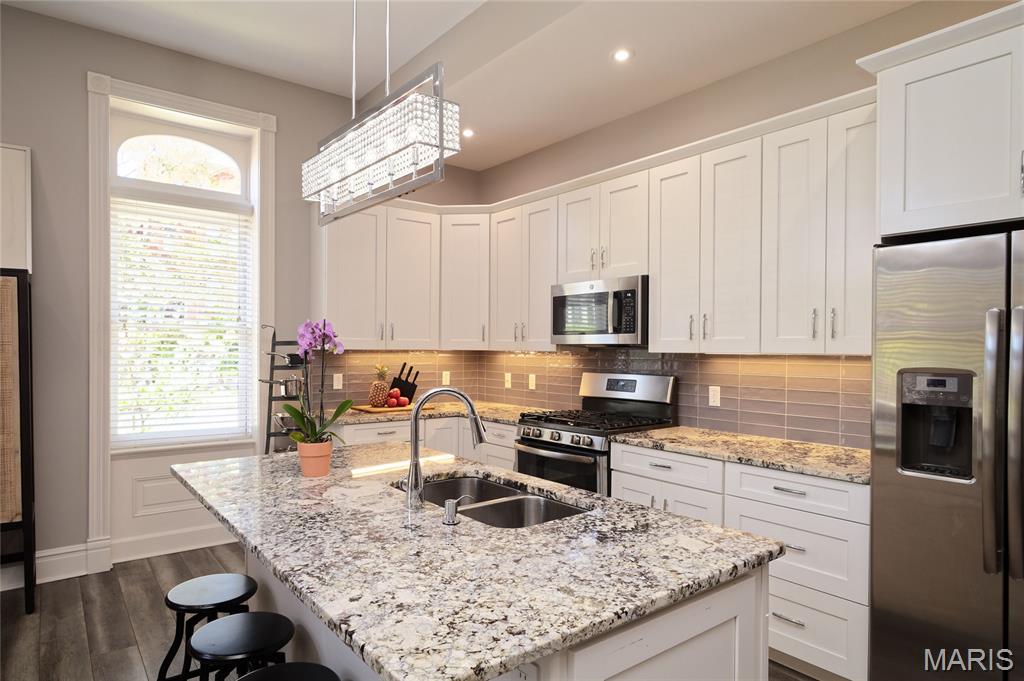 Stunning Condo at The Ruckert on 12th Immaculate main-floor residence offering 2 bedrooms and 2.5 baths with private in-unit laundry. This beautifully designed condo showcases high-end finishes and upgrades throughout, including elegant LTV flooring, abundant natural light complemented by recessed lighting, custom white oak built-in bookshelves in the living room. The gourmet kitchen is both stylish and functional, featuring a center island, creamy white cabinetry, stainless steel appliances, and custom historic trim that reflects the building’s timeless character. Both bedrooms are ensuite, with the guest suite enhanced by a Murphy bed for added versatility. Additional highlights include a building elevator, one assigned garage space, and private storage. The elevator provides direct access to the rooftop deck, where there are sweeping views of the Gateway Arch and picturesque Soulard. This upper deck creates an exceptional space for entertaining or unwinding. Ideally located in Historic Soulard (Community of Gardens), this home is just steps from popular restaurants, shops, parks, and the French Dog Park. Named for Henry Ruckert, the original owner, the building reflects his admiration for Parisian architecture. Completely rehabbed in 2019 and offering a 95% tax abatement for 10 years, approximately three more years. Showings begin Friday, 2/6 at 10:00 AM. Read agent remarks for more important information. Location: Ground level with just a few steps to the front door.